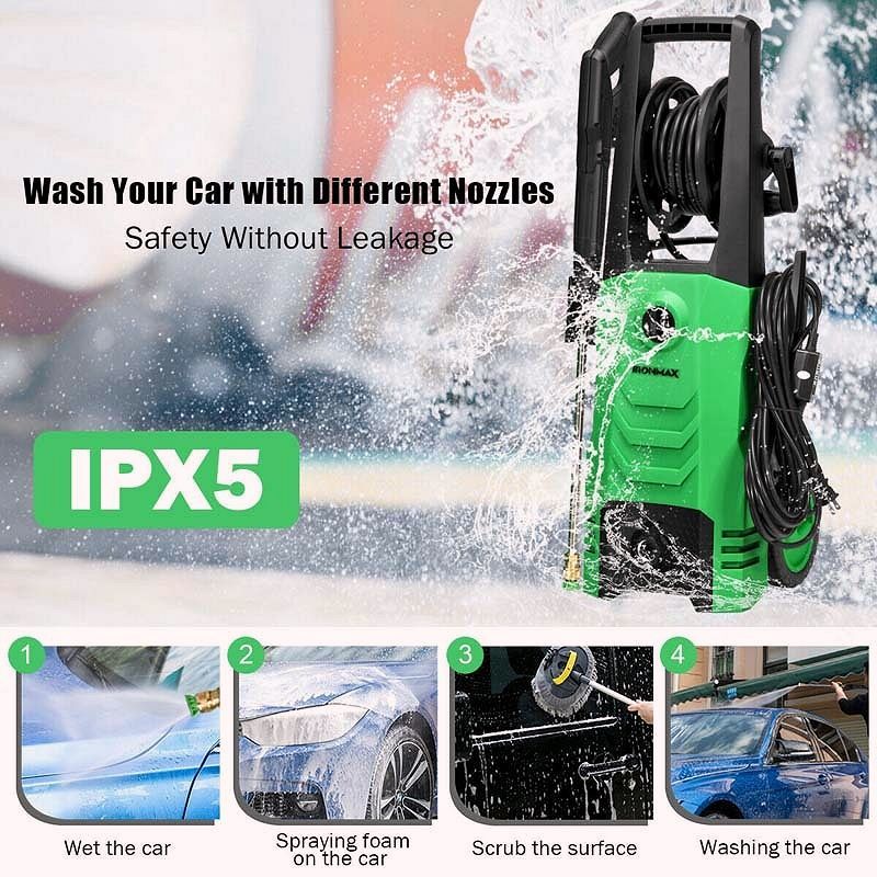 - 4 Interchangeable Nozzles & Soap Bottle: The high-pressure washer comes with 4 quick-connect nozzles of various sizes (0
