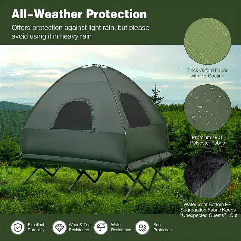 - All-Weather Protection & Elevated Design: Best care for you in diverse weather, the 5-in-1 camping tent cot is crafted of 190T PU-coated polyester with proper drizzle resistance, while it comes with a large sunshade to block direct sunlight. More important, the camping tent is 17" off the ground and has a bottom PE segregation fabric to avoid uninvited guests.