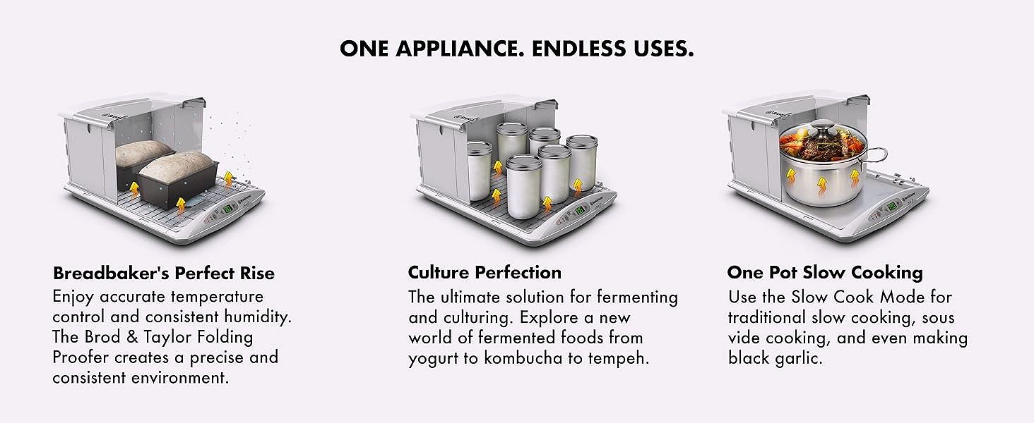 • The temperature and humidity control is perfect for rising and fermenting yeast bread dough or sourdough. In slow cooker mode. enjoy delicious one-pot meals using your own favorite Dutch oven or pot. Great for making yogurt. sous vide. tempering chocolate. and a wide variety of probiotic superfoods including soft cheeses. cultured butter. kombucha. tempeh. and kefir.