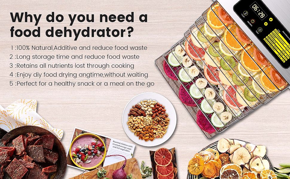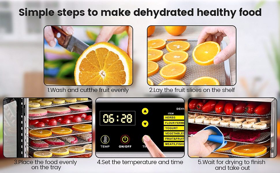 • ??FASHINONABLE STAINLESS STEEL DESIGN FOR THE BODY BASE??This food dehydrator is made of 100% BPA-free food-grade stainless steel. It's reliable and corrosion-resistant. and its fire resistance is good. which can play a role in fire isolation and greatly reduce the occurrence of accidents. Stainless steel odor before first use is a normal phenomenon. and it is necessary to open the machine door to emit the odor for 1-3 days.