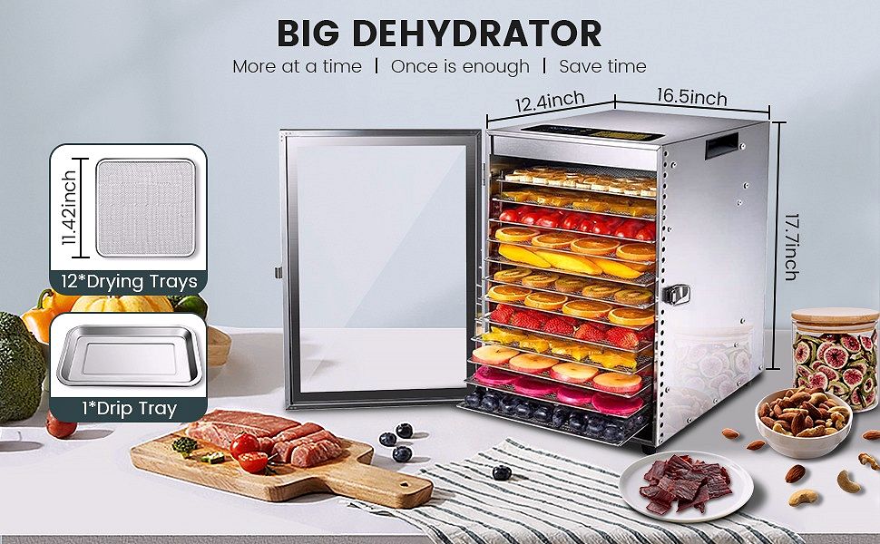 • ??12 LAYER STAINLESS STEEL TRAYS??Commercial food dehydrator is equipped with 12 detachable food grade stainless steel trays (11.5*11.5 in). with a wrapped design to prevent scratching. and is used for dishwasher cleaning. The height between the trays is 0.6in. allowing for drying of various vegetables. fruits. meat. and other foods. while retaining minerals and vitamins in the food. (Better effect when used in conjunction with our silicone tray set)