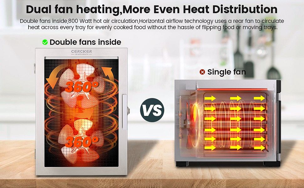 • ??HIGH EFFICIENCY TECHNOLOGY UPGRADE??The Cercker food dehydrator madchine adopts a rear 2 row drying fan and air circulation technology upgrade.Wind speed of 2m/s and a speed of 1600rpm. These technologies provide a heat evenly distributed and efficient food drying process. while preventing the shell from overheating.