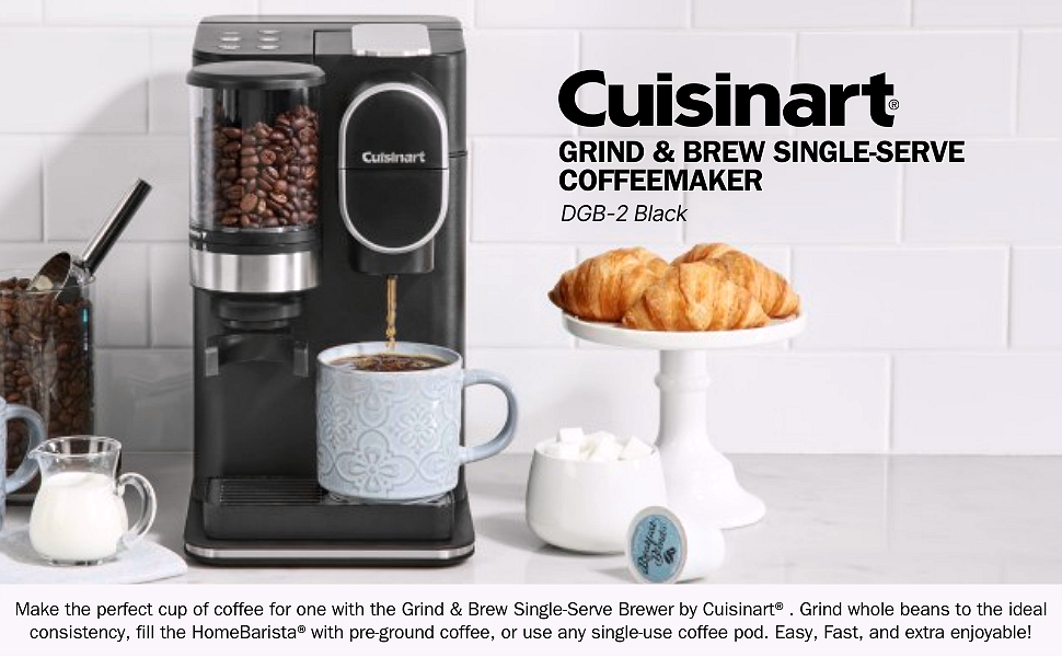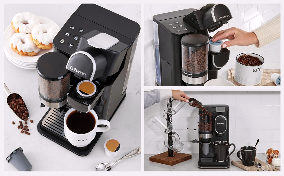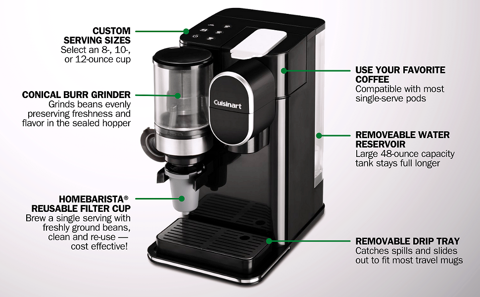 • SINGLE-SERVE: Enjoy three serving sizes with push button control C 8-ounces. 10-ounces or 12 ounces C compatible with any brand of single cup pod including Keurig K-Cup pods with an optional reusable filter cup so you can use your own coffee through our HomeBarista Cuisinart features