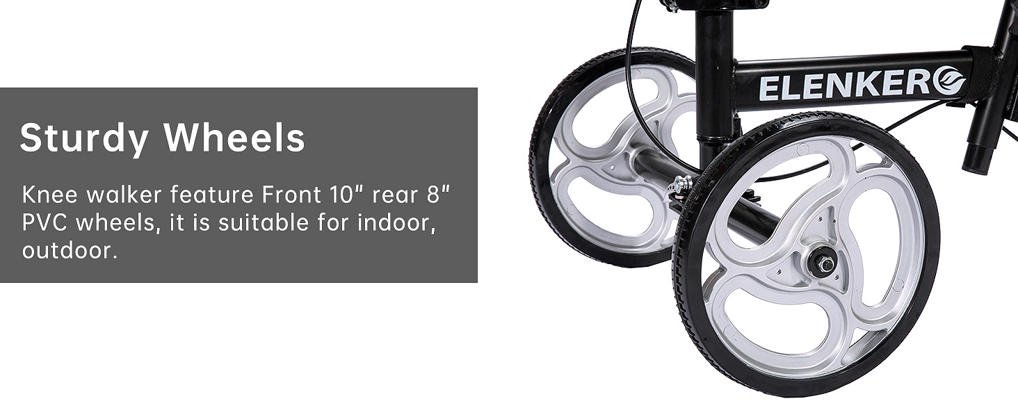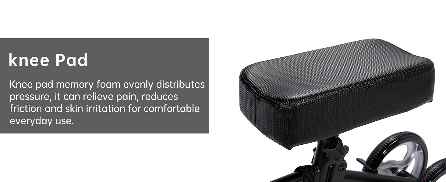 Foldable design: Knee walker is foldable and easy to transport and store. Locking brakes: Easy to use. Put down brakes to lock. help to safely slow down. Solid PVC wheel: Equipped with solid PVC wheel durable and not breakable.