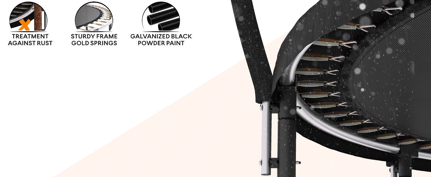 - Kids just wanna have fun - for a long time! We want your Jumpzylla super trampoline to look good as new for as long as possible! The frame is galvanized inside-out and the legs are powder coated for extra protection against rust. the thick foam is waterproof. so your new trampoline has a longer product life. And because we want to go the extra mile. we added the luxury plastic covered ladder for easy access and a comfortable use of your in kids trampoline for toddlers and older kids.
