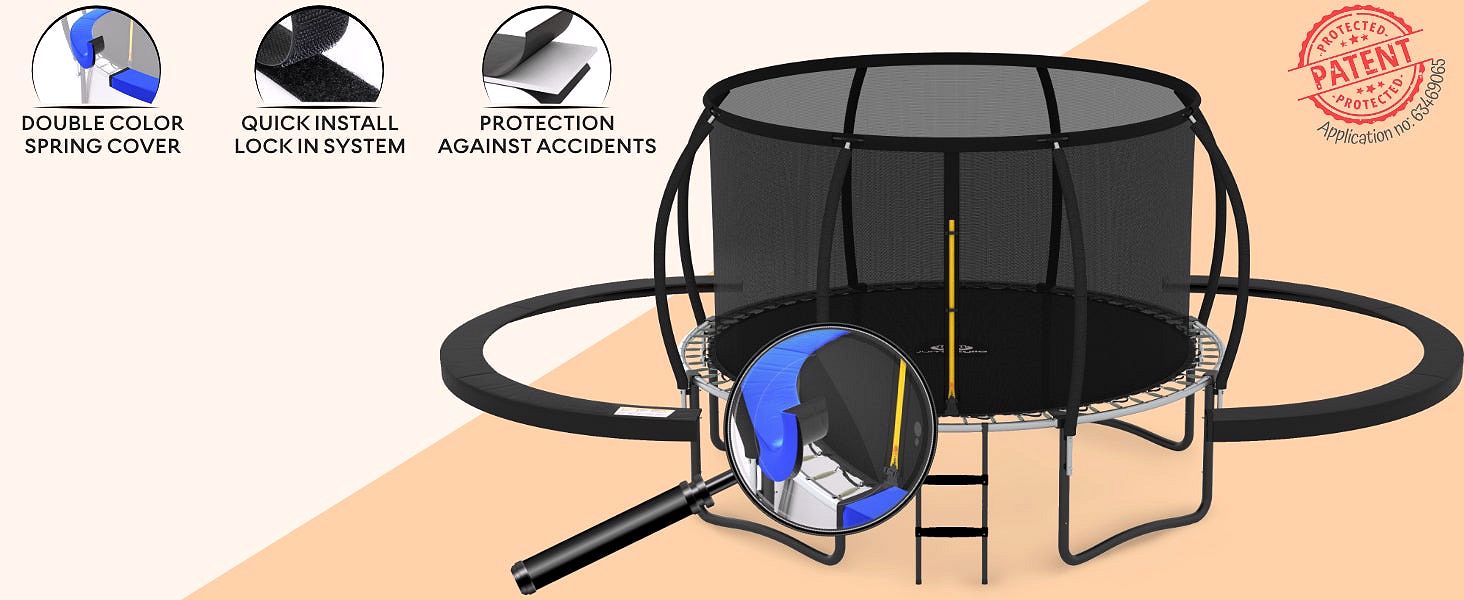 - Our New Patented Design - One Trampoline for Kids. Two Colors. We don't want our trampoline for kids and adults to be just fun and safe. we want it to look absolutely great too. So you never get bored. our designers have innovated the best solution for the coolest addition to your yard - your new big trampoline comes with the Patented (no: 635690635) double sided spring cover: black and the color of your choice. It's like having two different trampoline outdoor!
