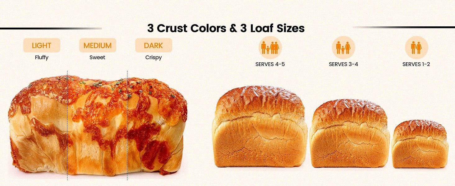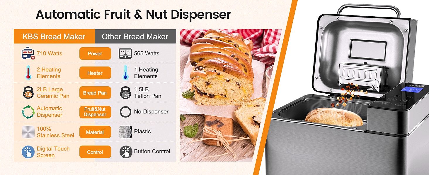 • 17 Nutritious Customize Menus & 2 LB Large Capacity & Auto Nut DispenserMore Than A Bread Maker. KBS Automatic Bread Machine has 17 auto programs (Gluten-Free.French.Whole Wheat.Sourdough.Pizza dough.Fermentation.Jam.Yogurt.Cake.etc). The multifunctional bread maker automatically kneads. rises and bakes. The fruit nut dispenser automatically releases the ingredients at the optimum time. The bread maker machine has 3 loaf capacity of 1/1.5 /2.0lb.3 crust color options in light/medium/dark.