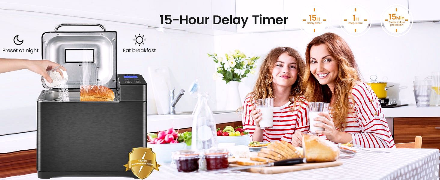 • 15H Timer. 1H Fresh Warm-keeping Function & Advanced Touch Panel Control & Extra 8 AccessoriesThe digital bread maker is equipped with a large intuitive touch panel. which makes the operation easier and more precise. The smart bread machine has a 15H Delay Timer. 1H Auto Keep Warm. 15-minute Power Failure Backup. so you don't have to get up early and have fresh bread anytime. KBS bread machine's accessories include: Paddle*2.Extra long heat resistant mitt.MeasuringCup/Spoon.Hook.etc.