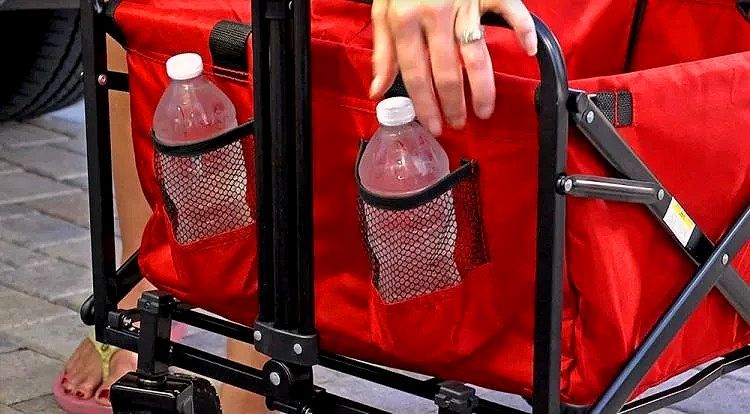 The folding wagon comes with a carrying case to easily haul it around when it's folded up, and is made from durable 600D Fabric that can be easily cleaned, which is super nice when the wagon collects dirt. Plus the wagon has an adjustable handle along with 2 mesh cup holders for your beverages to round it all out.