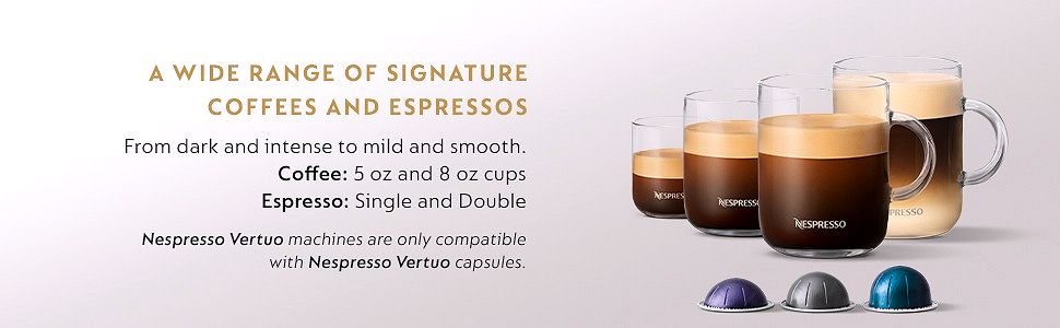 - VERSATILE AUTOMATIC COFFEE MAKER: VertuoPlus Deluxe makes both coffee and espresso in a variety of sizes: 5oz and 7.77 o coffees. and single and double espresso. Includes a free set of Nespresso Vertuo capsules (capsule assortment may vary from picture)
