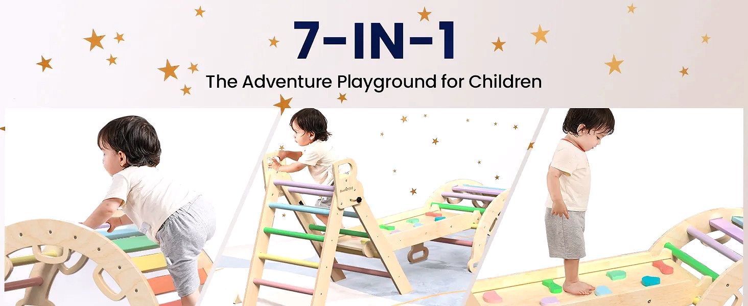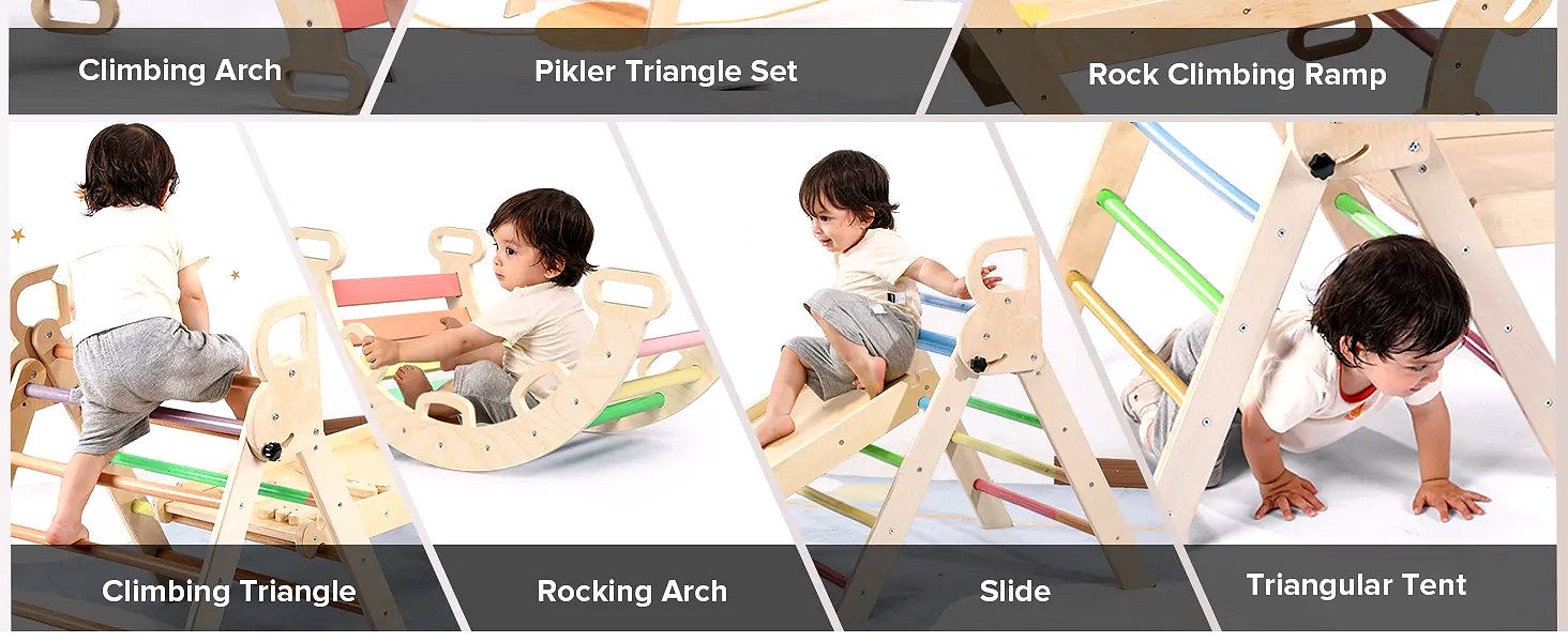 The newly upgraded 2024 Pikler Triangle set includes a triangle ladder, slide, and arch ladder. This combination allows children to create at least seven different play modes, providing more possibilities for active and imaginative play.