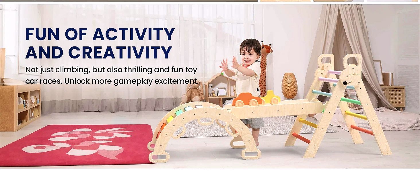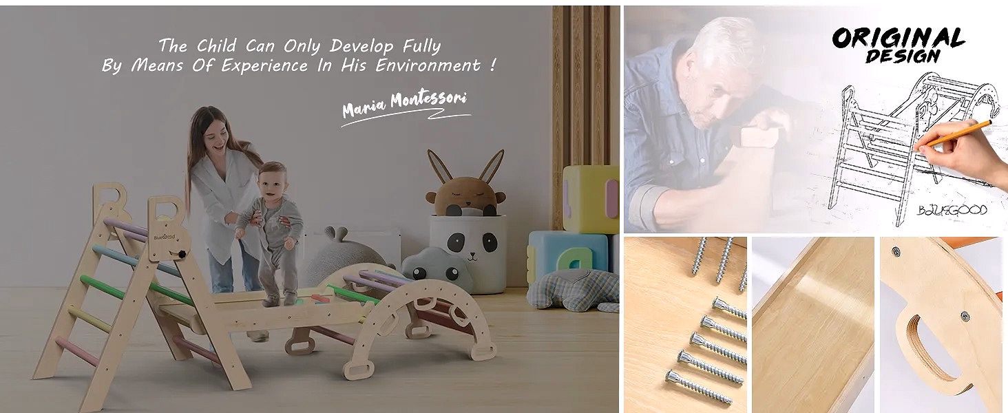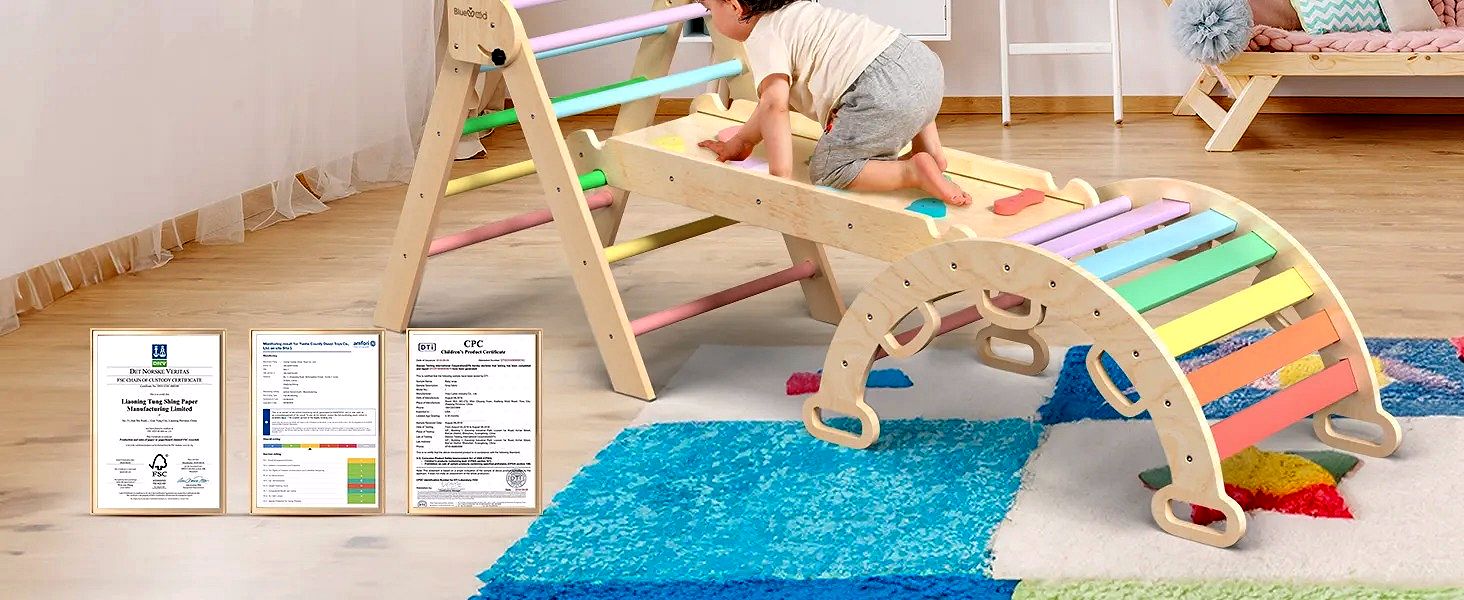 The BlueWood Montessori Climbing Set is made from FSC-certified 100% natural solid wood, ensuring an environmentally friendly and child-safe experience. The climbing toys have passed ASTM F963-17 and CPSIA testing standards, with safety as a top priority.
