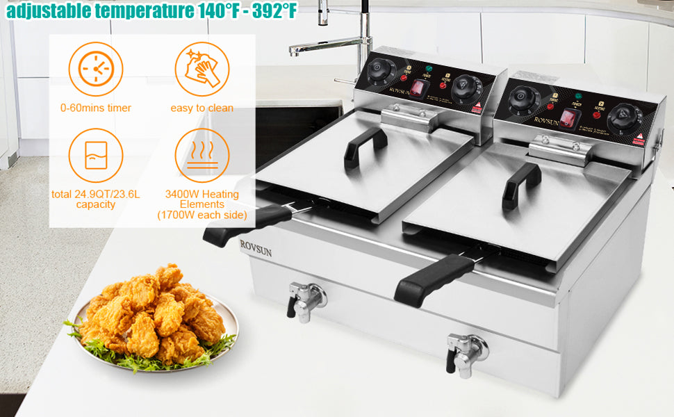 2026 New24.9 QT 110V 3400W Double Tank Electric Deep Fryer with Timer & Oil Drain