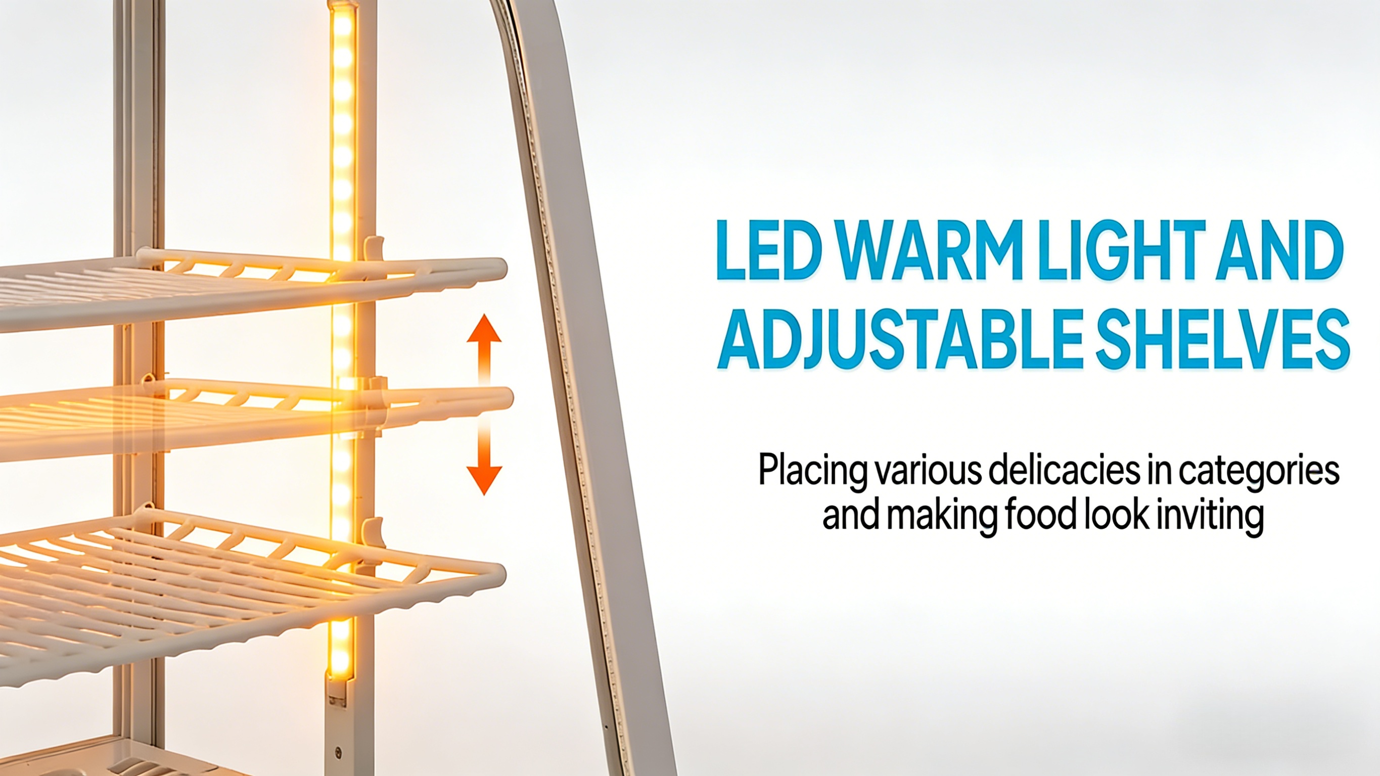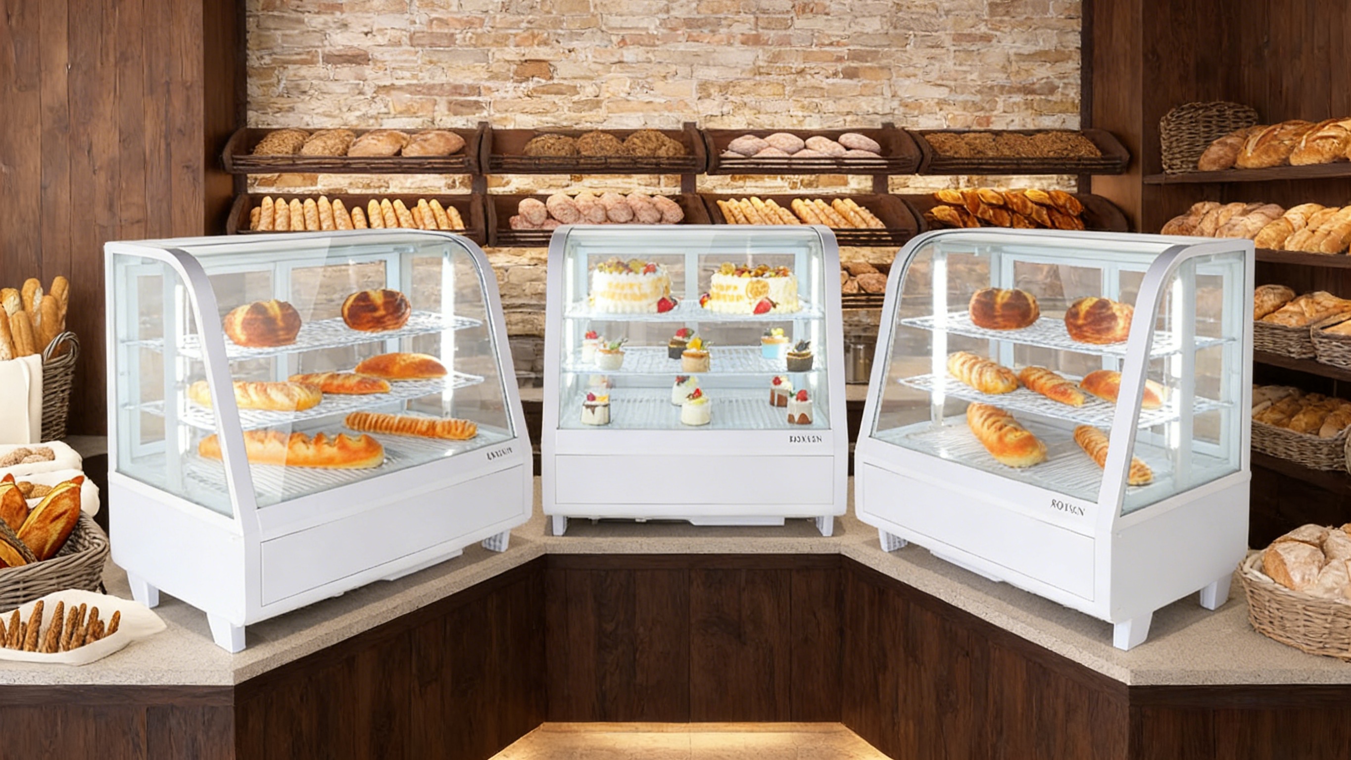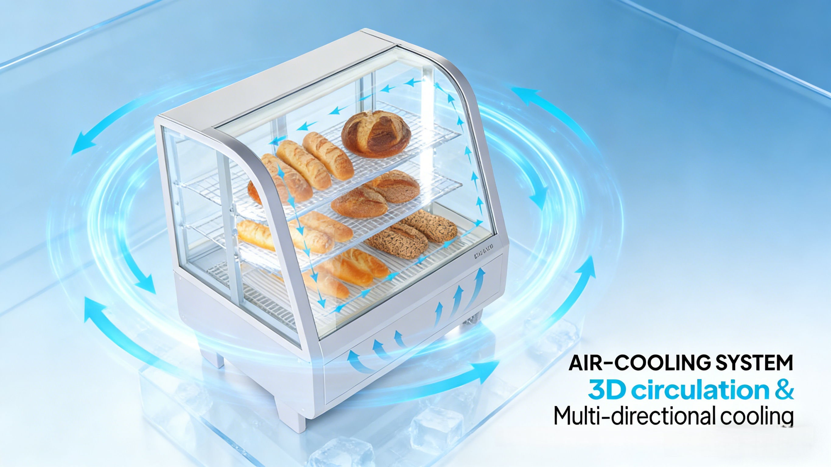 1. Fast Cooling & Automatic Defrost: Equipped with a powerful compressor, the bakery display case features fast cooling, energy conservation and low noise. Circulating cold air ensures uniform cooling, extending food preservation period. Auto-defrosting maintains clear visibility inside the display fridge.