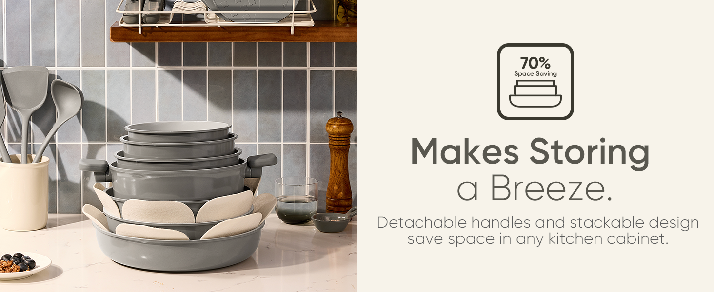 Space-Saving Detachable Handles: Easily transition from stovetop to oven, and even to the table. The removable handles save up to 70% more storage space when stacked.