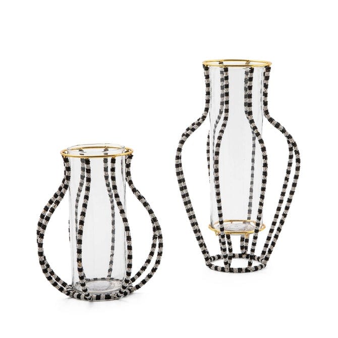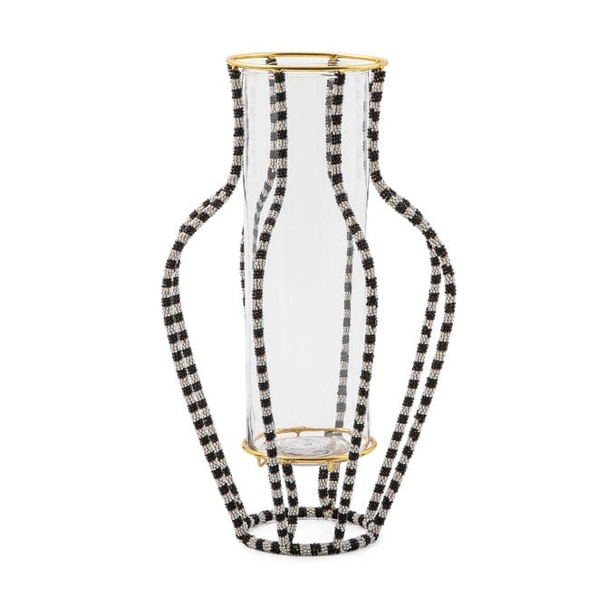 Present flowers or store pens and pencils in this unique large vase. It’s held by a metal frame, decorated with black and white beads, and topped with a golden rim.