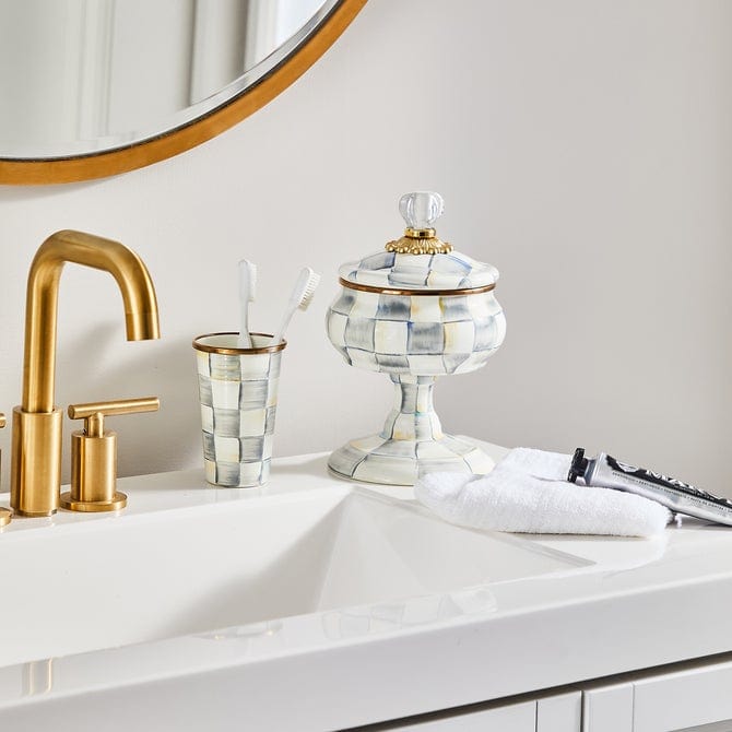 For housing treasured trinkets, there’s no container more charming than our Sterling Check® Curiosity Pot. The handsome curved pot with a perfectly matched pedestal is dressed in our grey checks and topped off with a lid featuring a brass bobeche and clear glass finial.