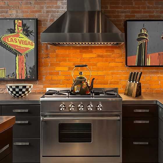 Suit your personali-tea with The Tea Kettle Collective. Express your affinity for all things inked with our Tattoo 2 Quart Tea Kettle, featuring vintage tattoo art on a heavy-gauge steel underbody, finished with a wood handle and a dice-shaped, black glass knob on the lid. Each special-edition Collective kettle makes a great cup of tea, of course, and adds MacKenzie-Childs style to your stovetop. Don’t be surprised that you need more than one.